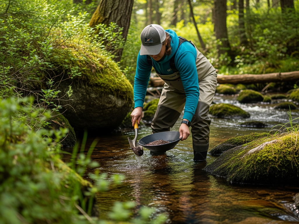 The stream sediment and Heavy Mineral Concentrate (HMC) sampling program in Western Newfoundland is designed to systematically assess drainage basins for mineral exploration targeting. Stream sediments (screened to 200 mesh/80µm) are collected to capture regional geochemical anomalies, while HMC samples (processed via panning or gravity separation) concentrate dense minerals (e.g., gold, scheelite, sulfides) that may indicate proximal mineralization. The sub-80 micron fraction is analyzed separately for pathfinder elements (e.g., As, Sb, W) to detect subtle dispersion patterns.